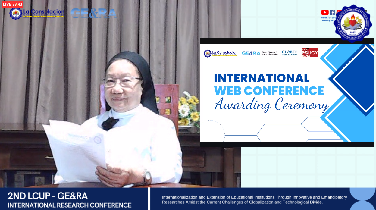 The La Consolacion University Philippines (LCUP) has once again proven its dedication to enhancing the quality of higher education through research as it hosted the 2nd LCUP-GE&RA International Web Conference in collaboration with its India-based non-government organization partner Globus Education and Research Association (GE&RA). The conference, with its theme "Internationalization and Extension of Educational Institutions Through Innovative and Emancipatory Researches Amidst the Current Challenges of Globalization and Technological Divide," was held on April 29 and 30, 2022, via Facebook live, YouTube live, StreamYard, and Google Meet.