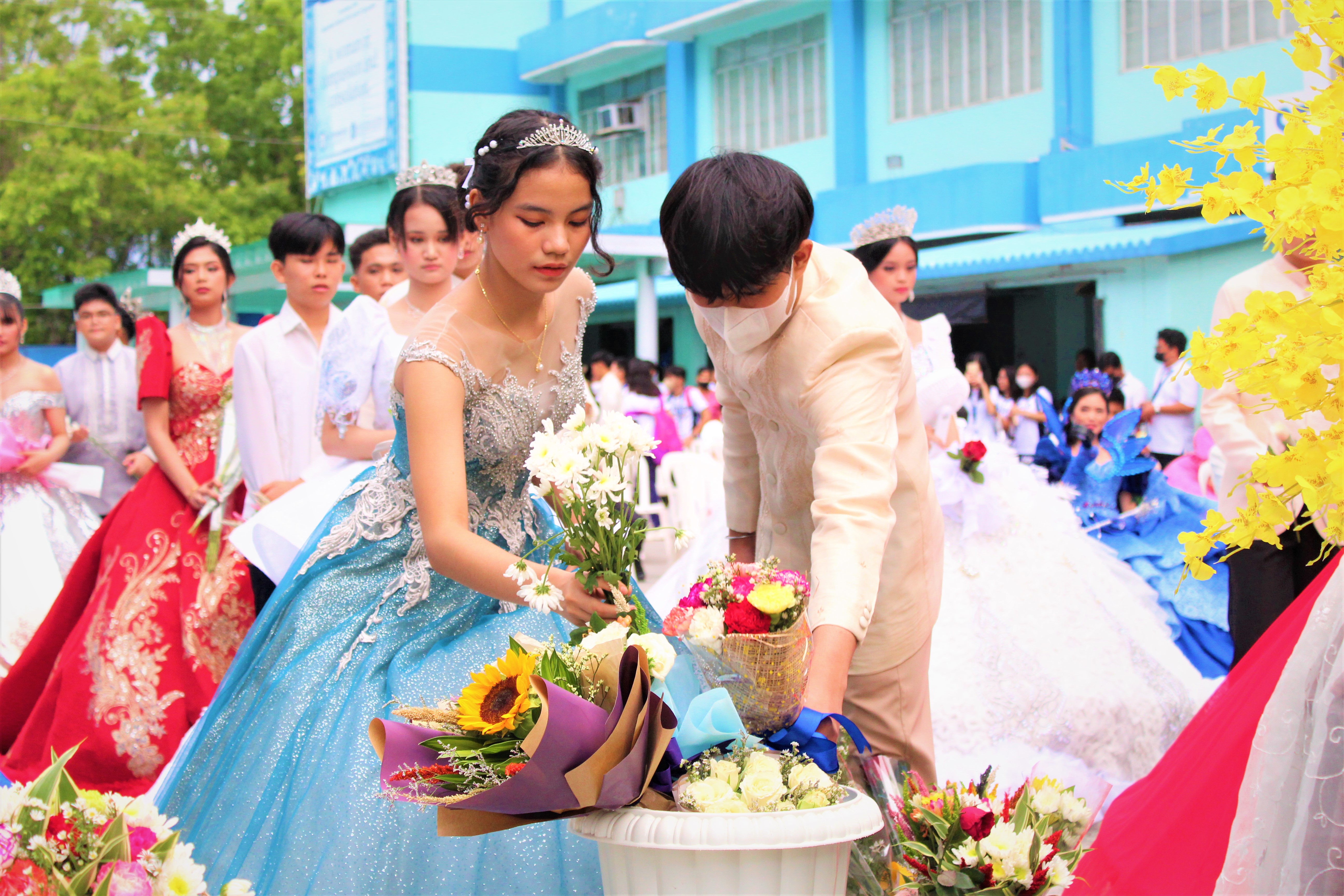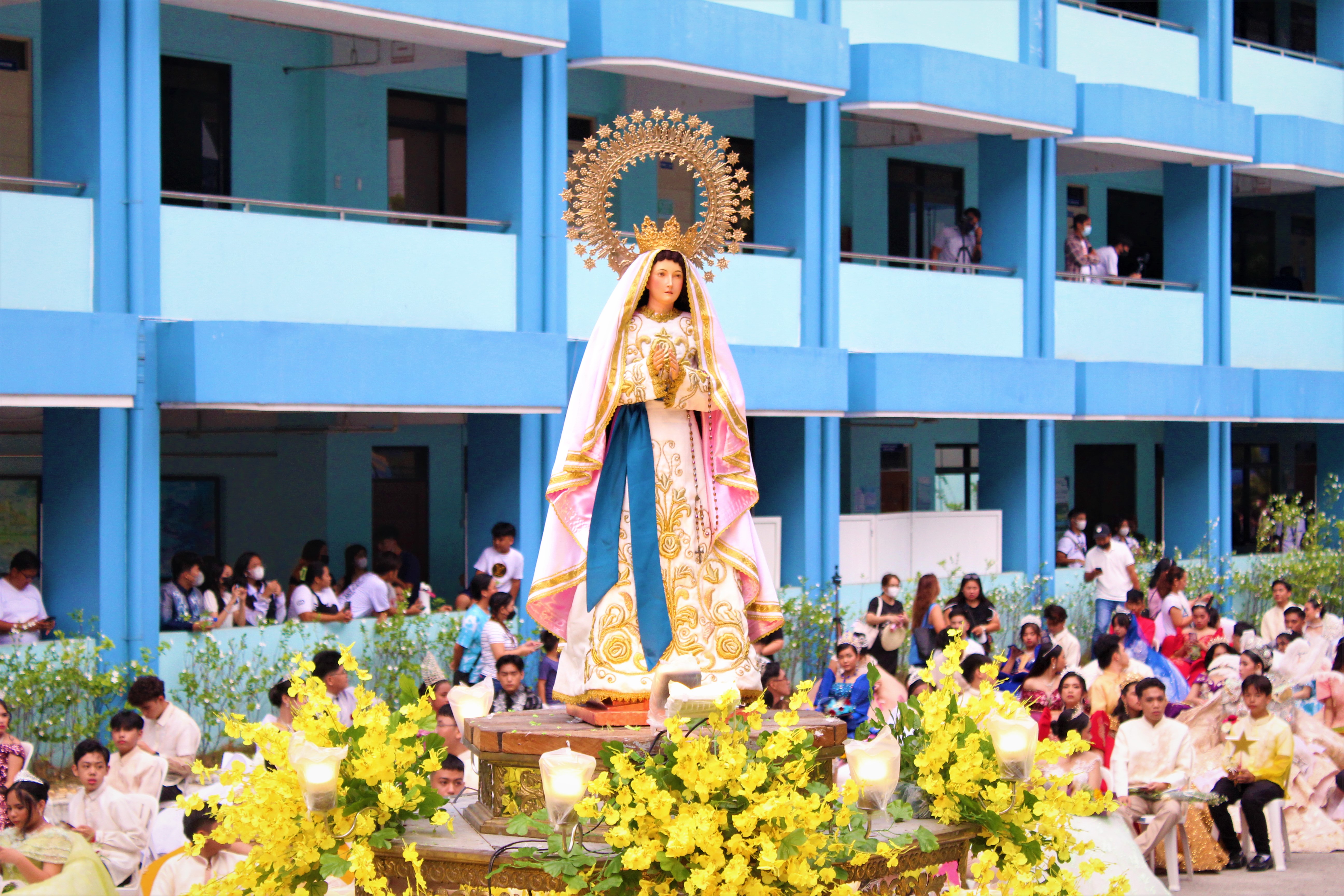 The Grand Procession involves a line-up of Nursery 2 to Grade 3 students who portrayed the eight angels bearing the “Ave Maria” symbols, Doce Estrellas carrying the 12 Stars from Grades 4 to 8 class, Reina de la Luna, Reina del Sol, and Regina Vexillum portrayed by three students from Grades 7 to 8, Sagalas and Reinas from Grades 7 to 12 carrying titles based on the Litany of Virgin Mary, Reinas holding the major titles portrayed by selected BED Faculty, joining BED Faculty as Damas y Caballeros de Maria, Hermana Mayor, and the Grand Caroza carrying the image of the Blessed Virgin Mary.